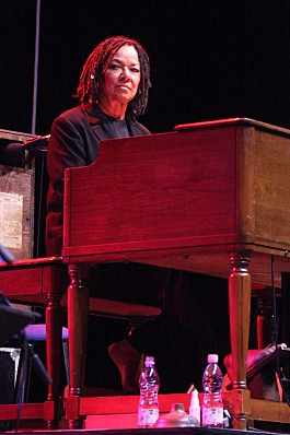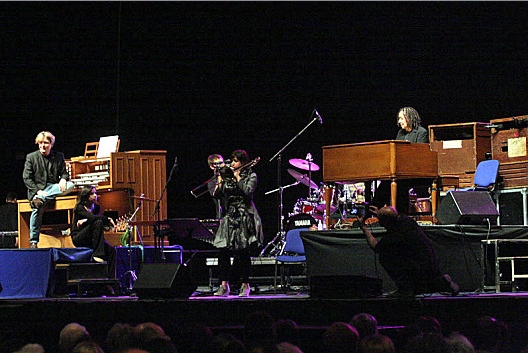 Sajnos némi felhő is megjelent az előadás gyönyörű egén, ugyanis eleinte orgonaművészünk hangszerének mélyebb tónusai torzultak kissé (pedig a Rodgers Trillium a világ legnagyobb hordozható koncertorgonája, Xavér számára készült), majd a Hammond rakoncátlankodott többször is, amit a rutinos zenésztársak folyamatos szólókkal és fantasztikus improvizációkkal tudtak feledtetni velünk. Itt említeném meg Rhoda másik zenésztársát, Lucien Daubat dobost aki ugyancsak frenetikus szólókkal ajándékozott meg minket. Egyik alkalommal Xavér átkísérte bálványát a nagyorgonához és Rhoda (kis segítséggel) ott is becsületesen helytállt. Bár sajnáltuk a művésznőt (nem ezt érdemelte), ezek a pillanatok is fokozták az élő zene varázsát.