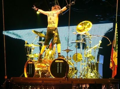 (naná hogy énekeltük), majd Kottak mester visszatért a láncokon függő dobszerkóhoz, hogy az új album "Raised on Rock"-jával gyorsítson a tempón és még két régi dal elhangzása után egyedül uralhassa az arénát egy látványban is élvezetes szólóval (Kottak attack), melynek a vége felé megmutatta, hogy nem csak a pólóján van a "Rock & Roll forever" felirat, hanem a hátára is felvarratta.